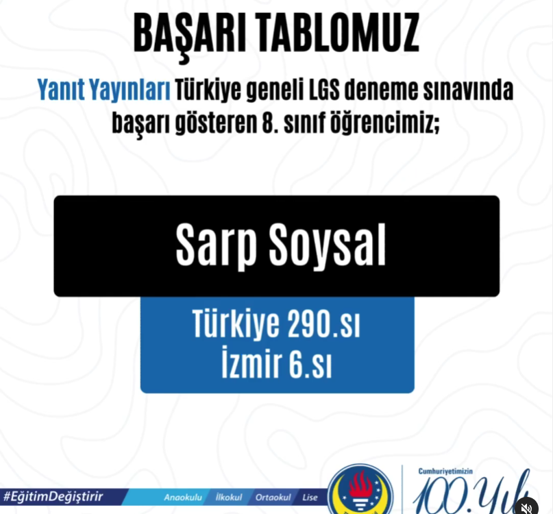 Yanıt Yayınları Türkiye Geneli LGS Deneme Sınavı’nda; 8.sınıf öğrencilerimiz, ????Sarp Soysal, 16417 öğrenci arasında, Türkiye 290.sı, İzmir 6.sı; ????Oğuz Özdemir, 16417 öğrenci arasında, Türkiye 493.sü, İzmir […]