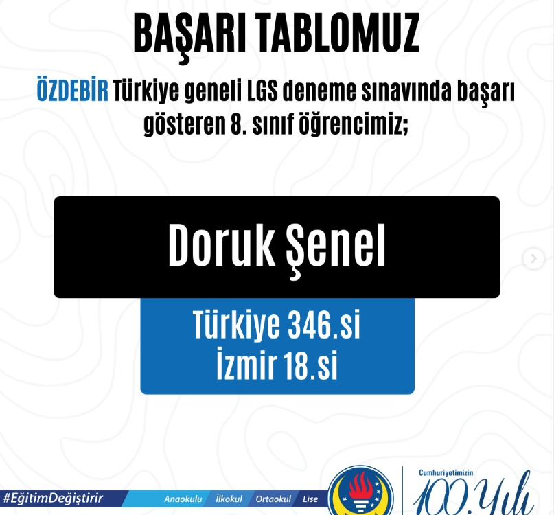 ÖZDEBİR Türkiye Geneli LGS Deneme Sınavı’nda; 8. sınıf öğrencilerimiz, Doruk Şenel, 61701 öğrenci arasında, Türkiye 346’ncısı, İzmir 18’incisi; Oğuz Özdemir, Türkiye 749’uncusu, İzmir 47’ncisi; Sarp Soysal, […]