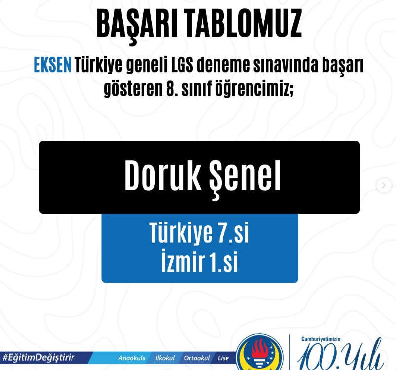 EKSEN Yayınları Türkiye Geneli LGS Deneme Sınavı’nda; 8.sınıf öğrencilerimiz, Doruk Şenel,1623 öğrenci arasında, Türkiye7’ncisi, İzmir 1’incisi; Ela Köroğlu, Türkiye 45’incisi, İzmir 2’ncisi; Seyit Deniz Toklu, Türkiye […]