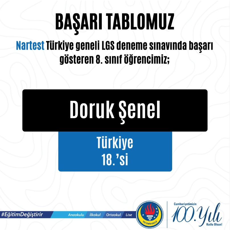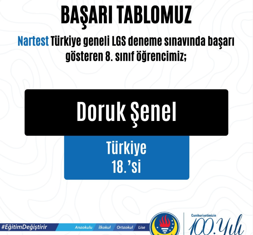 Türkiye Geneli Nartest Deneme Sınavı’nda; 8.sınıf öğrencimiz Doruk Şenel, 76677 öğrenci arasında Türkiye 18’incisi olmuştur. Öğrencimizi başarısından dolayı tebrik ediyoruz.