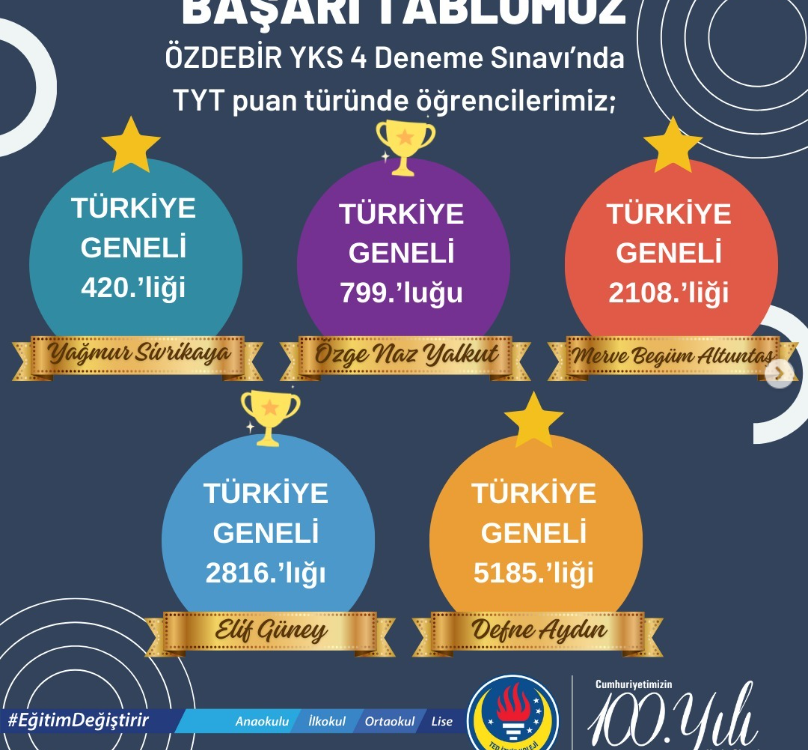 Türkiye geneli 246003 kişinin katıldığı ÖZDEBİR YKS 4 sınavında öğrencilerimizbüyük başarılar elde etmişlerdir. Öğrencilerimizi tebrik eder, başarılarının devamını dileriz.