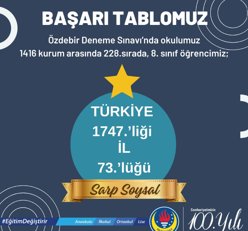 8.sınıflar seviyesinde Türkiye geneli ÖZDEBİR Deneme Sınavı yapıldı. Sınav sonucuna göre Sarp Soysal il gelinde 2972 öğrenci arasında 73. ve Türkiye genelinde ise 65.087 öğrenci arasında 1747. olmuştur.
