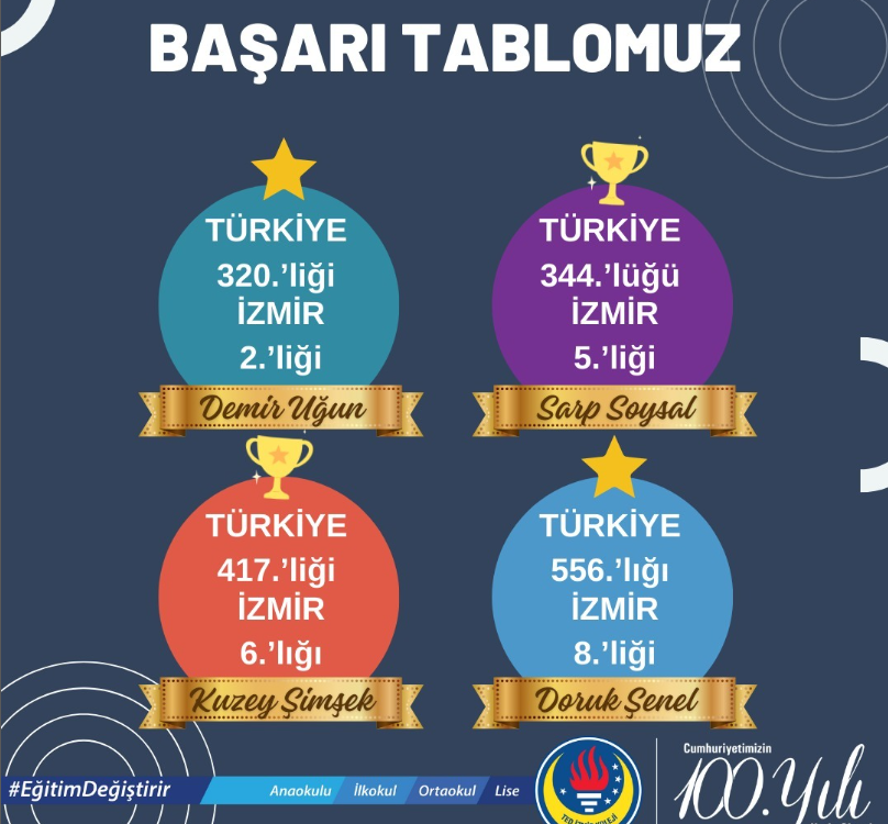 23 Şubat tarihli Türkiye Geneli Çanta yayınları 8. Sınıf LGS deneme sınavında okul derecemiz 530 okul arasında 20.’liktir. Öğrencilerimiz; Demir Uğun İzmir 2.’si ve Türkiye genelinde […]