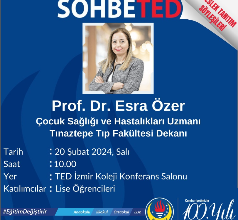 SohbeTED etkinliğinde bu hafta “Meslek Tanıtım Söyleşileri” kapsamında Prof. Dr. Esra Özer lise öğrencilerimizle bir araya gelecek.