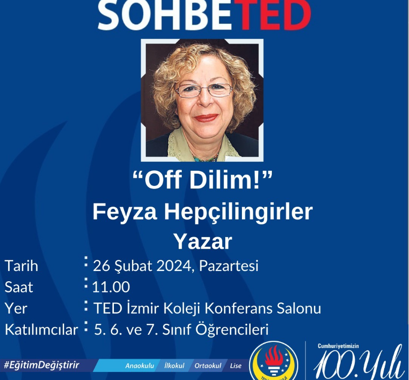 SohbeTED etkinliklerimiz kapsamında değerli yazar Feyza Hepçilingirler ile ortaokul öğrencilerimiz konferans salonumuzda yazarın “Of, Dilim!” kitabı üzerine sohbet edeceklerdir.