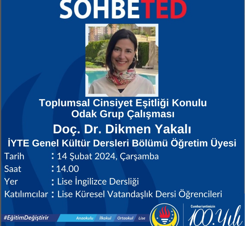 SohbeTED etkinliklerimizde bu hafta Doç. Dr. Dikmen Yakalı ile Küresel Vatandaşlık Dersi alan öğrencilerimiz “Toplumsal Cinsiyet Eşitliği Konulu Odak Grup Çalışması”nda bir araya gelecekler.