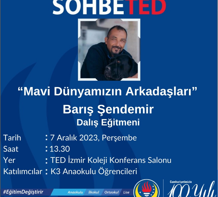 SOHBETED etkinliklerimizde bu hafta “Mavi Dünyamızın Arkadaşları” konuşmasıyla Dalış Eğitmeni Barış Şendemir, K3 Sınıfı öğrencilerimiz ile buluşacak.