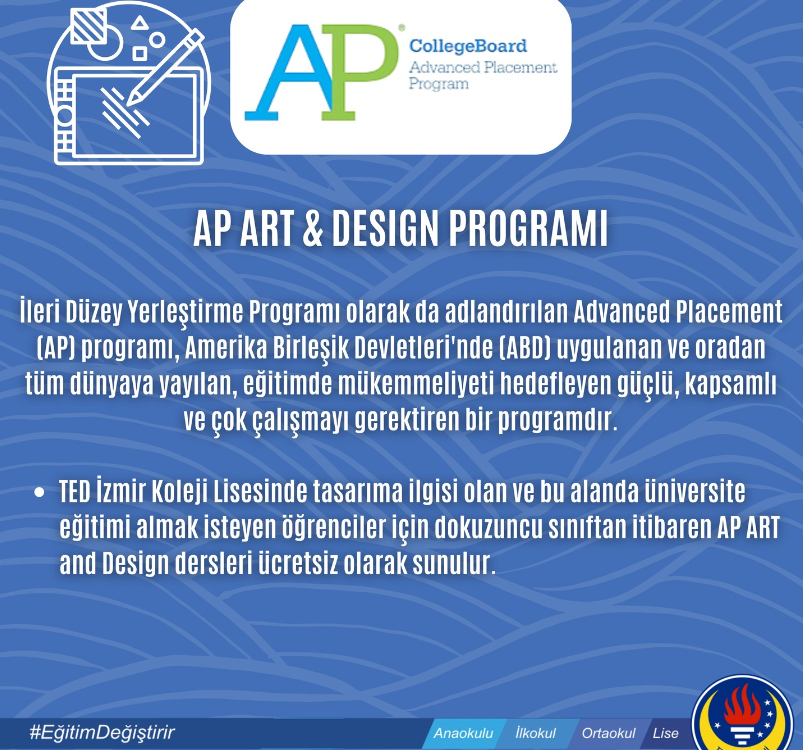 TED İzmir Koleji Lisesinde tasarıma ilgisi olan ve bu alanda üniversite eğitimi almak isteyen öğrenciler için dokuzuncu sınıftan itibaren AP ART and Design dersleri ücretsiz olarak sunulur.