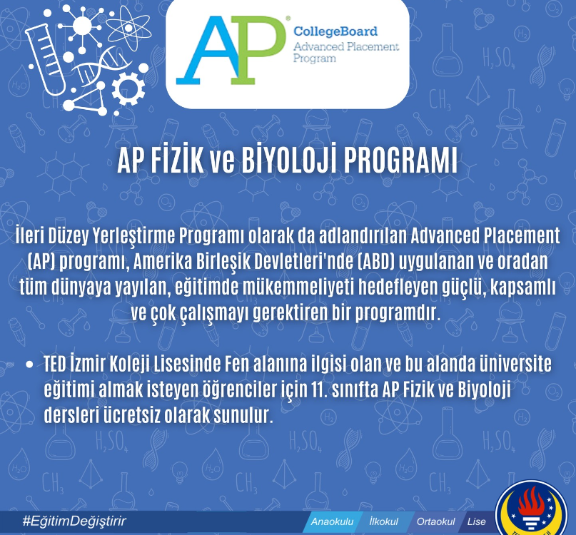 TED İzmir Koleji Lisesi’nde fen alanına ilgisi olan ve bu alanda üniversite eğitimi almak isteyen öğrenciler için 11. sınıfta AP Fizik ve Biyoloji dersleri ücretsiz olarak sunulur.